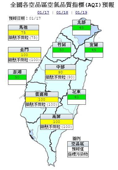 空氣品質方面,明天北部、竹苗、宜蘭、花東及澎湖為「良好」等級;中部、雲嘉南、高屏及馬祖、金門為「普通」等級,雲嘉南及高屏局部地區短時間可能達橘色提醒等級。