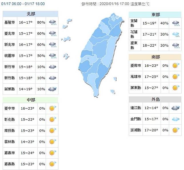 溫度方面,明天北台灣高溫僅17至19度,中南部24度至27度,花東22、21度,不過各地越晚越冷,入夜後至後天(18日)清晨,中部以北及東北部低溫下探12至14度,尤其北部局部空曠地區或近山區低溫約11度左右,其他地區低溫15、16度。