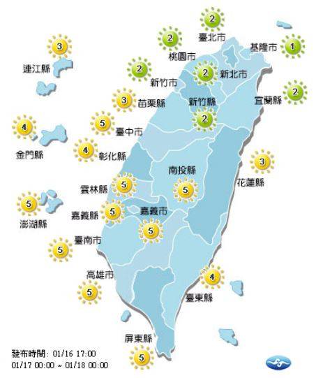 紫外線方面,明天台北市、新北市、基隆市、桃園市、新竹縣市、宜蘭縣為低量級;其他縣市均為中量級。