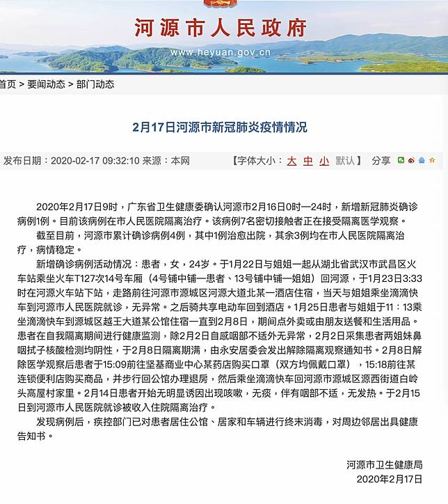 通報內容指出,該名確診女性今年24歲,上月22日與姐姐一起從武漢市武昌火車站乘坐火車回河源,隔天下午抵達河源火車站,到當地旅館住宿,之後再到河源市人民醫院就診並沒有任何異常。