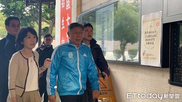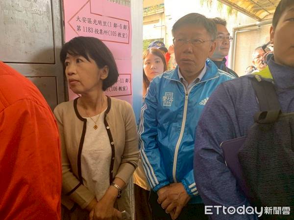 柯文哲今穿一身藍色運動外套,相當休閒,他與陳佩琪抵達後,隨即加入排隊人龍裡,與民眾一起等待投票。期間甚至有民眾前往「問診」,陳佩琪熱心給諸多建議,柯文哲則是幾乎靜默不語,偶爾回一兩句。