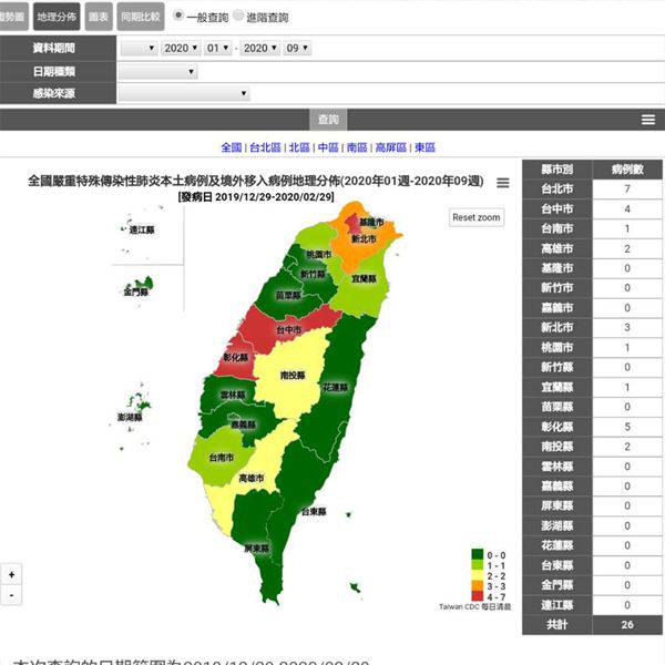 此系統先公布1至26例的位置,分布在北市7例(推測應該是50多歲女陸客、遊歐女陸客、自武漢至大連再返台的男台商、遊義大利返台的一家四口)、彰化5例(推測是50多歲女台商及被她傳染的丈夫,以及首例死亡白牌車司機及其母親、弟弟)、台中4例、新北市3例(推測為第24例的60多歲「北部女」與其女兒、外孫女25病例、26病例)、高雄2例(推測是曾去金芭黎大舞廳的男台商與一女台商)、南投2例、台南1例、桃園1例、宜蘭1例。