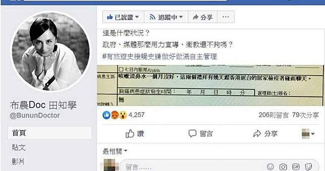 田知學近期經常在臉書粉絲團發表疫情衛教,不過昨(20日)晚間她卻貼出一張診斷書,只見病患主訴欄寫著「咳嗽流鼻水1個月沒好,這2個禮拜有幾天跟香港返台的居家檢疫者碰面聊天」。田知學怒道:「這是什麼狀況?政府、媒體那麼用力宣導、衛教還不夠嗎?有旅遊史接觸史請做好做滿自主管理!」