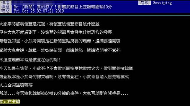 謝震武評論韓國瑜事件延燒,網友在PTT八卦版PO文,指謝之所以嗆韓,是因「一起主持節目的谷懷萱辭職不在旁邊!」,認為「懷萱是小武哥的拘束器啊,沒有懷萱在,小武哥會陷入自走砲模式。」