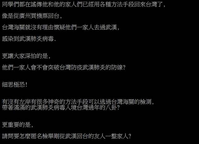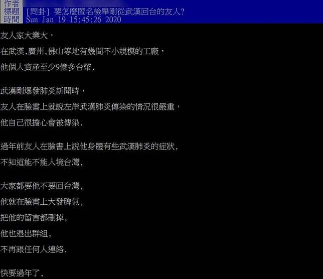 一名網友在PTT上求助,表示朋友在中國武漢、廣州、佛山經營幾間規模不小的工廠,個人資產至少9億多新台幣,在臉書上坦承有些許症狀,疑似感染武漢肺炎,過年不知道能否入境台灣,沒想到近日同學間卻謠傳他和家人已經用盡各種方法返台,像是到廣州買機票回台,可能就可以順利突破防疫防線入境台灣,讓原PO上網求助「請問要怎麼匿名檢舉剛從武漢回台的友人一整家人?」對此,疾管署副署長莊人祥回應,民眾若有任何疑慮,都可以撥打1922防疫專線詢問專業建議。