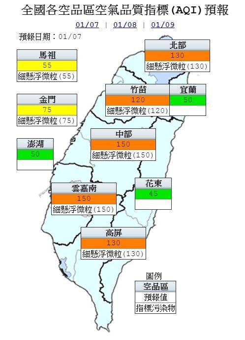 空品方面,明日北部、竹苗、中部、雲嘉南及高屏空品區為「橘色提醒」等級,中部及雲嘉南於清晨及夜間局部地區可能達紅色警示等級。