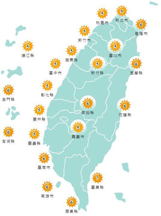 紫外線方面,明日除基隆市、宜蘭縣、花蓮縣、台東縣、金門縣、澎湖縣、南投縣、台南市、高雄市以及屏東縣為橘色「高量級」,其它縣市皆為黃色「中量級」。