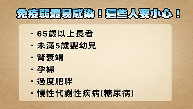 江坤俊也提醒,65歲以上長者、未滿5歲嬰幼兒、腎衰竭、孕婦、過度肥胖及患有慢性代謝性疾病者,因為免疫弱容易感染流感重症,所以要特別小心。根據衛生福利部疾病管制署統計,肺炎鏈球菌引相關病例個案主要集中在未滿5歲的嬰幼兒及65歲以上的老年人,累積發生率以75歲以上老人最高,其次為2-4歲幼兒。患有慢性代謝性疾病患者中,近三年以糖尿病的患者,流感併發重症比例最高,其次為心血管疾病及腎臟疾病。要預防感冒,營養師黃淑惠建議,可以多補充含維他命C或β-胡蘿蔔素的食材,強化黏膜讓細胞緊緻,抵抗感冒病毒入侵。更多「病毒感染」的相關內容,請鎖定TVBS 56頻道每週六、日晚間7點《健康2.0》,節目中將有詳盡的示範和解說。