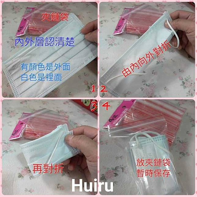 有護理師在《護理師的日常》臉書粉絲團表示,口罩目前供不應求,民眾在口罩短缺的情況下,不可能用完口罩就丟,但隨便塞在背包、抽屜或口袋,或者攤在桌上,拿起來再使用的時候,難免會擔心防疫效果打折,因此希望透過簡單4步驟教學,教大家正確收起用過的口罩。