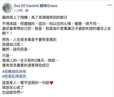 雖然文中沒有說明「極特別的節日」為何,但推算時間與結婚週年頗為接近,這是Grace回收阿翔後,兩人的第一個結婚週年,Grace保持正能量說:「愈難過的時候,愈要記得微笑!」讓網友相當心疼。