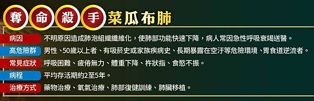 早期在治療菜瓜布肺時,僅能使用類固醇、化痰藥等,進行少許的症狀解除,效果有限也無法阻止肺功能下降,往往到最後必須等待肺臟移植,所幸這幾年,已經有針對菜瓜布肺的藥物問世,為這些患者爭取到更多的時間。