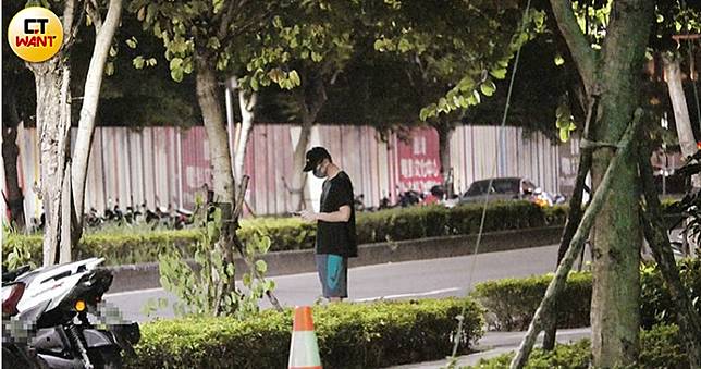 返家換裝的李國毅,戴上口罩和帽子,邊滑手機邊等人。(圖/攝影組)