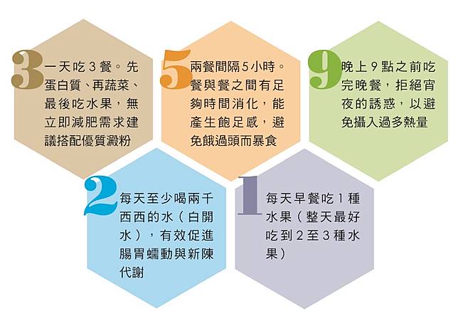 想要均衡飲食又能減重成功,可採用35921的做法。首先一天只吃3餐,拒絕3餐以外的零食誘惑,先吃蛋白質,然後吃蔬菜,吃的時後慢慢嚼,最後吃水果吃到八分飽,進食時間不超過60分鐘;其次,每一餐之間一定間隔5個小時、拒絕宵夜的誘惑,在晚上9點以前一定吃完晚餐。每天最少喝2000 ML的水;最後,每天的早餐吃1顆蘋果。