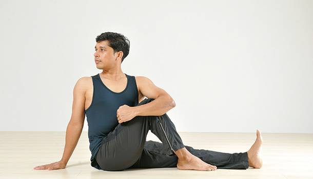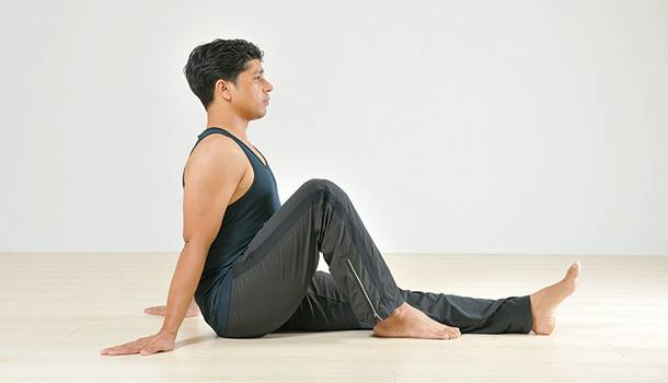 ③臀部坐穩,左側上半身轉向右側,左手抱住右腿。