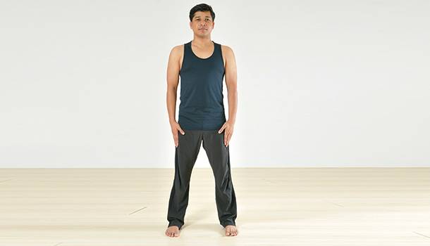 ①雙腳打開與肩同寬,雙手臂自然下垂。