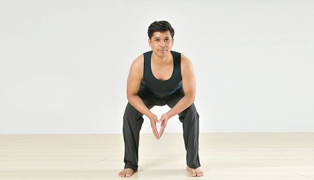 ②雙腳趾頭朝外,膝蓋彎,臀部緩緩蹲下,直到雙手可以碰觸地面(雙手放在雙腿中間)。膝蓋如感到疼痛,半蹲即可。