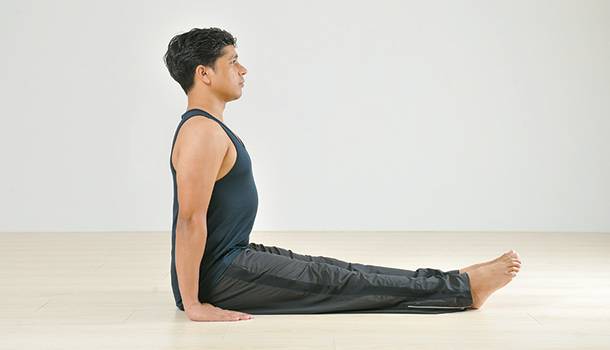 ①坐在地上,雙手扶在臀部兩側,雙腿伸直,背打直與雙腿呈直角。