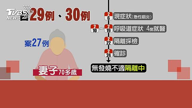 家族群聚感染的還有,案27例的70多歲妻子2/6出現急性咽炎2/10到19日期間甚至4度就醫,22日隔離後同樣今日確診,目前沒發燒不適症狀,仍在隔離當中。