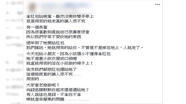 這名網友在臉書社團「爆怨公社」發文表示,家中一名長輩很喜歡自誇、吹墟,因此他們其他晚輩平常都不喜歡收這名長輩給的禮物,就連過年的紅包也不例外,起初原PO一直推托說不用,怎料對方竟直接用丟的給他,「不管是不是掉在地上,人就走了。」