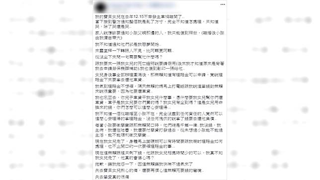 這名單親媽媽在臉書社團「爆怨公社」發文表示,從離婚之後,她就獨自一人撫養小孩,怎料寶貝女兒2019年底發生車禍不幸離世,當她接到警方通知時,整個人亂了方寸,完全不知道怎麼處理,那時家人認為應該要通知前夫家的人,而崩潰的她也只是傻傻地照著做,怎料卻換來一場惡夢。
