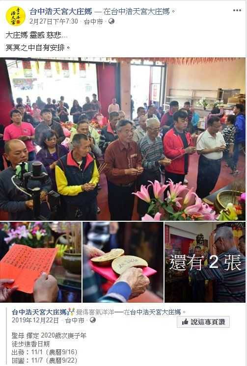 台中市梧棲區大庄浩天宮「大庄媽」,依照百年來的傳統,今年將前往北港朝天宮進香,隔年就到53庄輪流繞境,以庇佑地方平安,不過每年幾乎都是在3月到5月舉行,去年12月擲筊請示媽祖何時出發,卻指示改到今年11月1日再進香,這讓不少信眾嘖嘖稱奇,直指是媽祖冥冥之中安排,要避開新冠肺炎疫情。