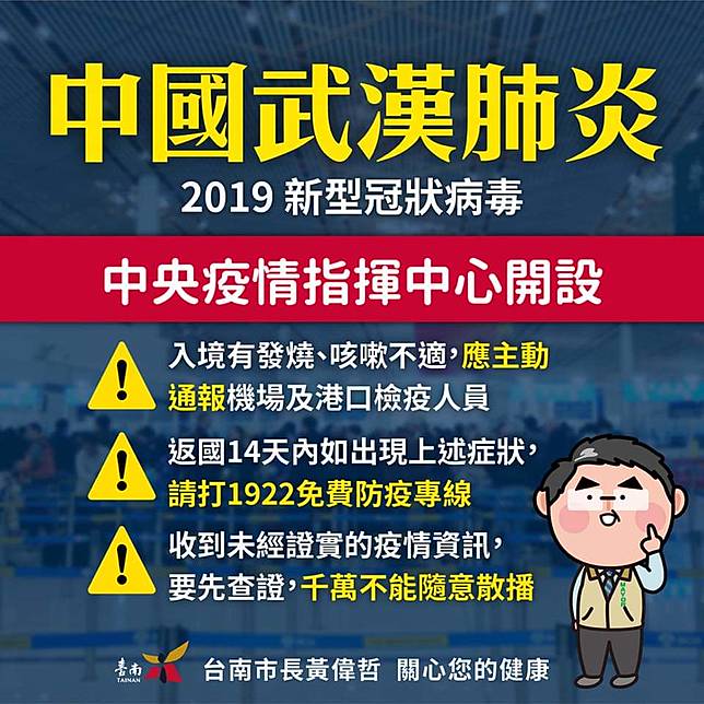 衛生局再次呼籲,民眾近期前往中國時,應落實肥皂勤洗手、咳嗽配戴口罩等個人衛生措施,避免接觸野生動物及急性呼吸道感染症患者,也避免出入傳統市場及醫療院所;返國入境時如有發燒、咳嗽等不適症狀,應主動通報機場檢疫人員,請勿私自服用退燒藥造成防疫漏洞,病人或家屬如果隱匿疫情,將依違反傳染病防治法第31條,處新台幣1至15萬元罰鍰;返國14日內如出現上述疑似症狀,撥打免付費防疫專線1922或本局防疫專線06-2880180並依指示戴上口罩,衛生局安排後續收治醫院,就醫時請告知醫師旅遊史、職業別、接觸史及是否群聚(TOCC),以及時診斷通報。其他「嚴重特殊傳染性肺炎」相關資訊,請上衛生局資訊網瀏覽「https://health.tainan.gov.tw」。