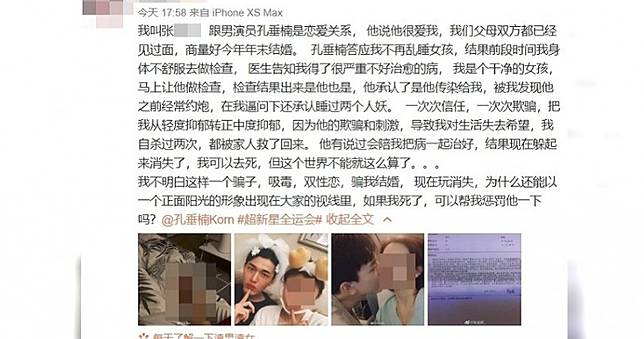 28歲新生代男演員孔垂楠被爆料約砲變性人,四處亂搞還染上性病,甚至傳染給女朋友,導致對方憂鬱症病情愈來愈嚴重;事件曝光後,引起網友撻伐。孔垂楠沉默一整天,20日深夜終於發文道歉,「將暫緩一切演藝事業和相關活動。」