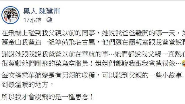 42歲藝人黑人(陳建州)的父親陳培元曾是華航座艙長,他於1994年4月26日名古屋空難中不幸殉職,至今黑人搭機仍經常想起父親。近日黑人搭華航前往馬來西亞,沒想到在機上巧遇父親生前的同事,姐姐們告訴黑人他父親離開那一天上機前的情景,讓黑人倍覺暖心直呼「謝謝妳們告訴我!」