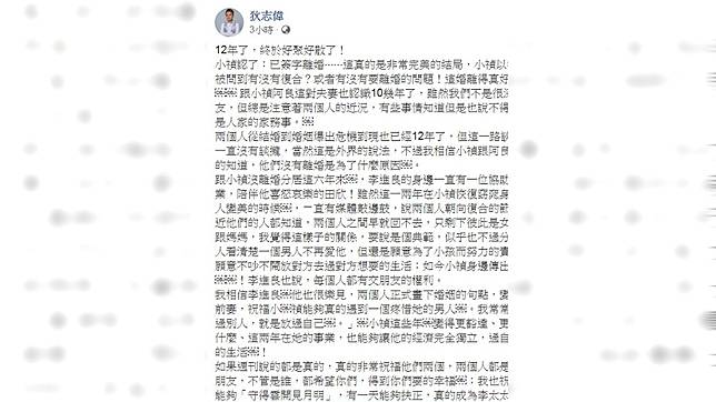 「12年了,終於好聚好散了!」狄志偉今在臉書上表示,小禎終於簽字離婚真的是非常完美的結局,「小禎以後不用再被問到有沒有復合?或者有沒有要離婚的問題!這婚離得真好…。」