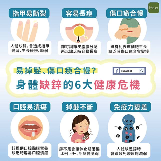 掉髮頻繁,傷口遲遲沒癒合?也許是身體缺鋅了。鋅是非常重要的微量元素,有60%分布在骨骼肌中、30%分布在骨骼中,肝臟、皮膚則各佔5%,所以肌肉跟蛋白質的製造、長高、免疫系統、皮膚健康等,都需要靠「鋅」來推動。美國期刊《Nutrition》(營養)也在2018年刊登了一份「特刊」,裡面就提到「鋅」在人體各處產生的作用。以下來告訴你當人體缺鋅時,會有什麼症狀發生。
