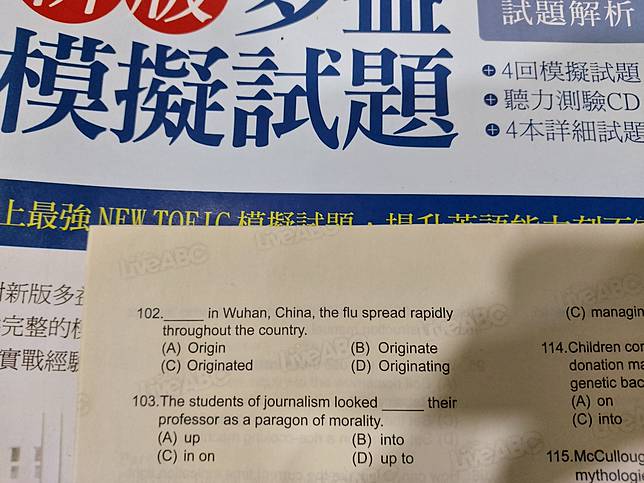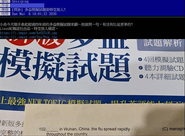 一名網友在PTT以「多益模擬試題是時空旅人?」為題發文,他說他今天順手拿起超過四年前的多益模擬試題來,並放上圖片,只見圖片中的一道題目寫著,「 in Wuhan, China, the flu spread rapidly throughout the country.」