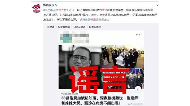 綜合陸媒報導,最近微博上瘋傳一則謝賢離世消息,標題寫下「83歲謝賢血液粘如粥,深夜腦梗離世,謝霆鋒和妹妹大哭,甄珍在病房不能出現」文章吸引約65萬人次點閱,引網熱議,網友紛紛表示,「嚇我一跳」、「嚇死了」。