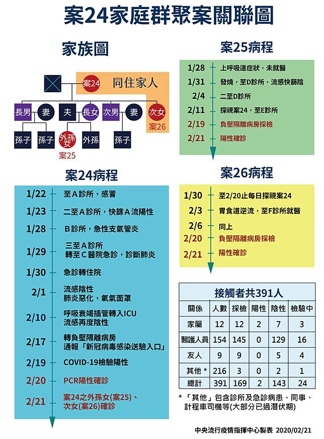 針對第24例婦人引發的家庭群聚,目前指揮中心已匡列相關接觸者共391人,已採檢169人,其中2人陽性確診即是第25例及第26例,另143人陰性、其餘24人檢驗中。