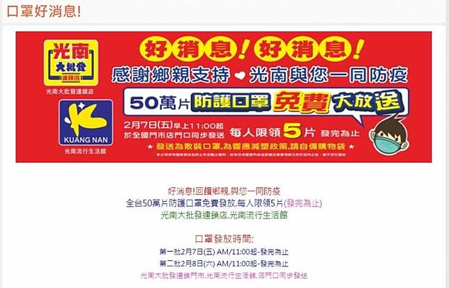 光南在官網和臉書宣布,為了回饋台灣鄉親,將在全台免費發放50萬片口罩,每人限領5片,這些口罩將分2批發放,時間分別在7日上午11點起,及8日上午11點起,數量有限,發完為止。