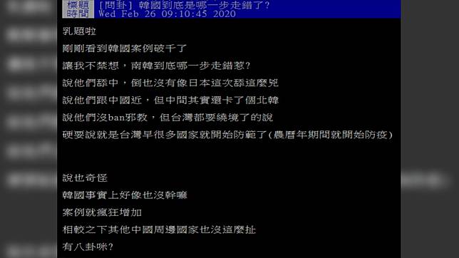 原PO在PTT發文,表示南韓在一個禮拜內,確診人數從20幾例暴增至上千例,如今還有12人因感染不幸身亡,讓他很是納悶,「說他們跟中國近,但中間其實還卡了個北韓;說他們沒ban(禁止)邪教,但台灣都要遶境了的說。」原PO認為,台灣這次之所以能夠有效防範,除了運氣好,另一個原因就是「早很多國家開始防範」。