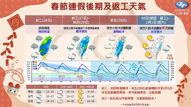 氣象表示,下週日(2/2)冷空氣逐漸減弱,早晚氣溫仍低,西半部地區區留意日夜溫差,各地大多為多雲到晴,只有花東地區有零星小降雨。