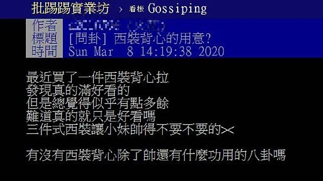 有男網友在PTT的八卦版發文,標題為「西裝背心的用意?」他提到最近買了1件西裝背心,發現真的滿好看的,但是總覺得似乎有點多餘,難道真的就只是好看嗎?三件式西裝讓小妹帥得不要不要的,有沒有西裝背心除了帥還有什麼功用的八卦嗎?」