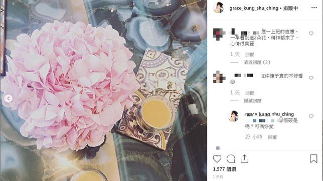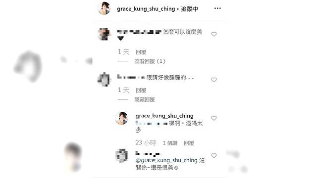 Grace昨天(28日)在IG上曬出她站在富麗堂皇的酒店拍的美照,但照片中的她雙眼卻明顯非常浮腫,看起來就像大哭過一樣,有網友關心詢問「眼睛好像腫腫的…」,Grace坦言「嘿啊。酒喝太多」。