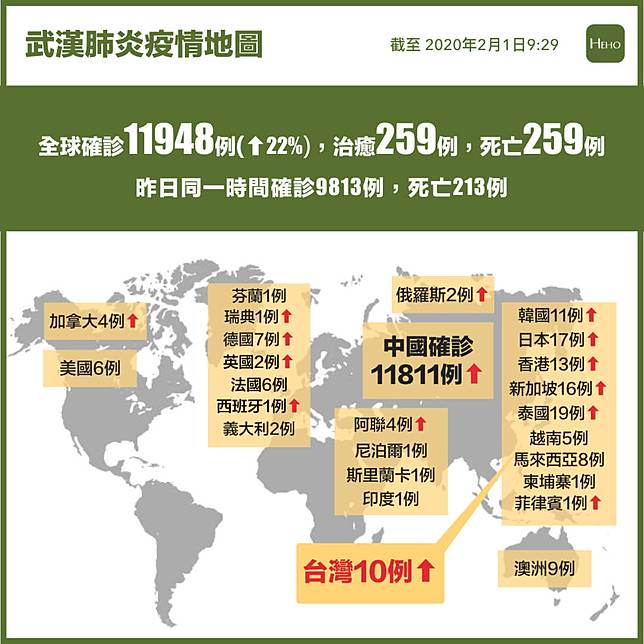 2019新型冠狀病毒(武漢肺炎)疫情持續失控,全球確診人數破萬來到1萬1948例,其中又以中國湖北最為嚴重,一日內又新增1300多例病例,死亡病例增加45例,中國(含港澳)的確診數已達1萬1811起,死亡人數為259人。在境外部分,瑞典、英國、俄羅斯相繼淪陷,全球25國有確診案例出現。