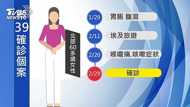 根據先前疫調資料,台灣第39例患者,是北部60多歲女性,1月29日跟團到杜拜旅遊,2月21日抵達埃及,行程結束前20號,就出現喉嚨痛咳嗽症狀,2月28日在台就醫採檢通報,隔天確診我國立刻通報WHO,埃及政府也接獲消息,當地12名個案在6號確診,因此60多歲台灣籍婦人,被列為「指標個案」,但根據口述,研判是遭到埃及導遊傳染。