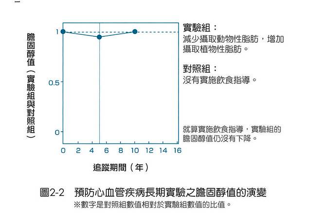 結果,儘管實驗組以降低膽固醇值為目的,克制雞蛋、膽固醇和動物性脂肪的攝取,但在實驗組和對照組之間,膽固醇值並沒有太大變化。