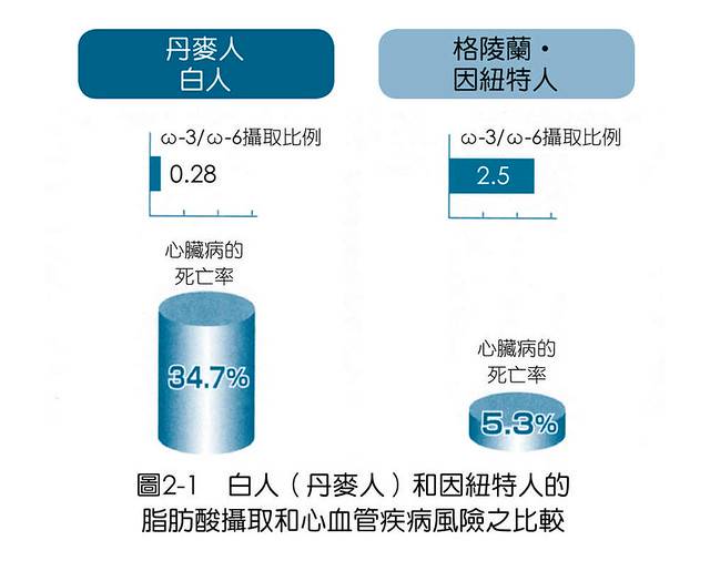 然而,丹麥人的心肌梗塞死亡率卻比較高,中風、癌症、過敏疾病的罹患率也高於因紐特人。儘管雙方皆攝取相同程度的脂質,疾病的罹患率卻有很大的差異,這是因為脂質所含的脂肪酸比例有所差距。