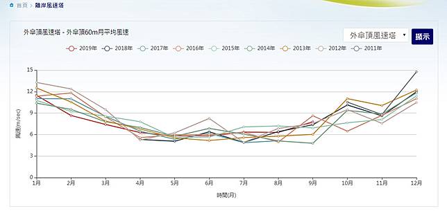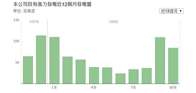 陸域風機的部分,根據台電網站,台電指出,「因台灣東北季風強盛,故每年1~3月及10~12月的發電量約佔整年度之70%。」不過,整體的月發電量可能因新增風力發電設備而略有誤差。
