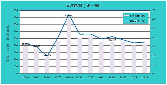 以2019年5月往前追溯一年資料(2018/6-2019/5),毛發電量最高落在10月的390萬度,最低落在8月的114萬度。但同年6-7月仍有185萬度左右,約是最高點的47%左右。(2019/05以後海洋風電第二期工程開始施工,影響停機時數與發電量,故統計至2019/05。)