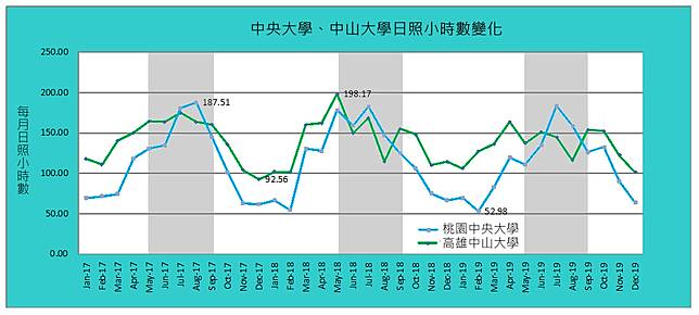 南部的中山大學,在2018年8月跟2019年8月,日照小時數都曾降到115小時左右,雖然是「夏天」,但近似一般冬季的表現。