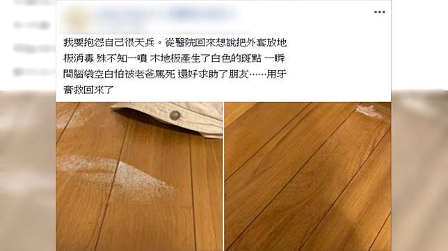 這名網友在臉書社團「爆怨公社」發文表示,從醫院回家後,怕細菌會殘留在外套上,想說先拿酒精噴外套消毒一下,他便把外套放在木地板上用75%酒精噴一噴,怎料造成木地板出現白色斑點,嚇得趕緊求助朋友。