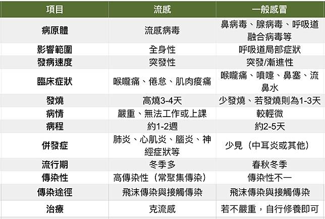 而流感症狀發作很突然,初期發燒、頭痛、喉嚨痛,有七到八成患者會有咳嗽症狀;最大差別是會全身痠痛、倦怠,若症狀嚴重,有可能需幾個星期才會完全康復。