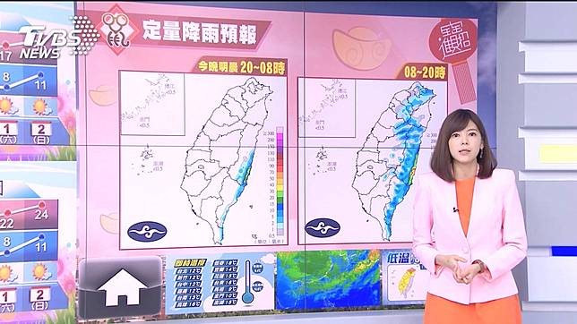 這波寒流一連冷4天,加上乾冷伴隨輻射冷卻效應,高雄以北、宜蘭低溫7到11度,空曠處和近山區平地氣溫將更低,屏東、花東也只有12到14度左右,其中,最冷的時間點將落在周四開工日到周五清晨,周日白天稍回溫,不過早晚依舊冷。