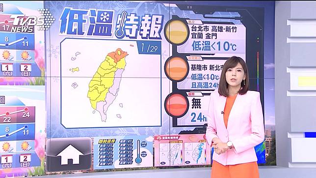 寒流來襲,務必做好保暖措施,氣象局針對17縣市,發布低溫特報,台北市、新竹至高雄,還有宜蘭和金門,今天(29日)上午到白天有10度以下低溫出現的機率,另外也首度發布低溫「橙色燈號」,包括基隆、新北、桃園,感受將非常寒冷。