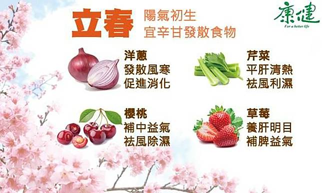 經過漫長的冬天,想必許多民眾都儲備了不少脂肪,因此春天要開始減少脂肪攝取,攝取多一點優質蛋白質,可適量吃些魚肉、豆類及豆製品;而冬天蔬菜種類少,維生素攝取相對不足,立春開始也要多多食用新鮮的綠色蔬菜。